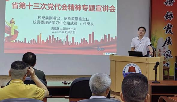 7月6日下午,离退休人员服务中心党委召开理论学习中心组学习会,邀请学校纪委副书记、纪检监察室主任、党委理论学习中心组成员付继发作省第十三次党代会精神专题宣讲。学习会由离退休中心党委书记、主任欧海清主持。