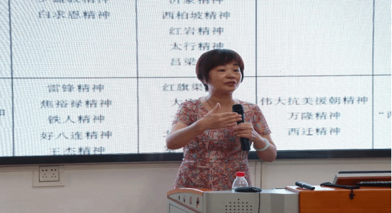 课堂上,洪小瑛老师首先提出了:“从共产党精神体系中汲取力量是汲取什么样的力量?”这一问题,由此引入主题,带领同学们了解什么是共产党的精神谱系,并将中国共产党的精神谱系比作坐标轴,以中国共产党为原点,以百年接续的纵向发展为纵坐标,以英雄模范、典型地域、历史时刻、科研攻关、奋进实干交织叠加的多维延展为横坐标,呈现出立体多维的整体谱系图,洪小瑛老师以理科生惯用的思维模式,让同志们更加清晰明白地理解中国共产党精神谱系的内涵。