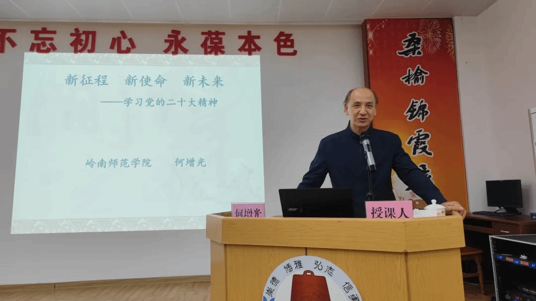 何增光重点围绕“深入学习贯彻党的二十大精神”从“党的二十大召开的背景”“党的二十大对老年人的影响”和“如何学习贯彻落实党的二十大精神”等三个方面进行了深入浅出地宣讲。