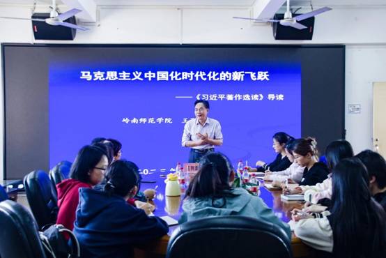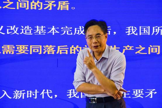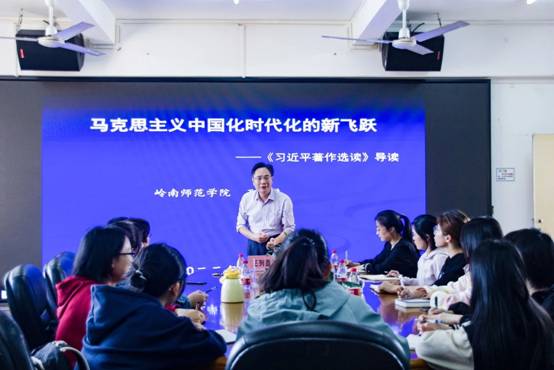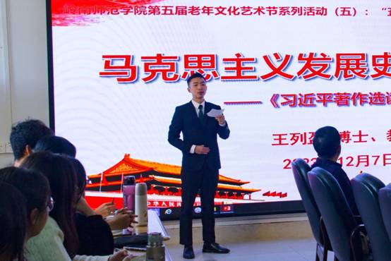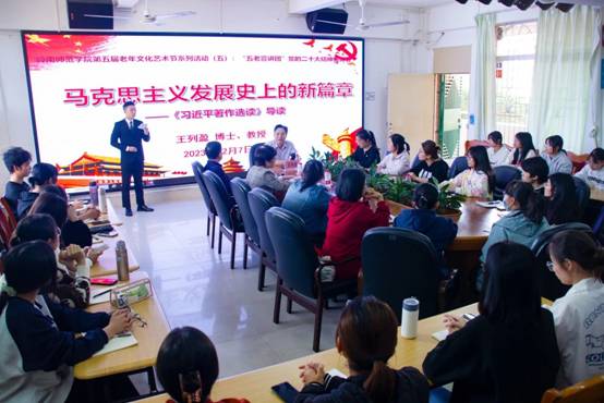 此次宣讲会中,王列盈教授以“马克思主义中国化时代化的新飞跃”为主题,深入剖析《习近平著作选读》中有关中国特色社会主义新时代发展的内容,点明其意义,并分别从著作出版的基本情况、回答的重大时代课题、蕴含的世界观和方法论三方面展开讲述。