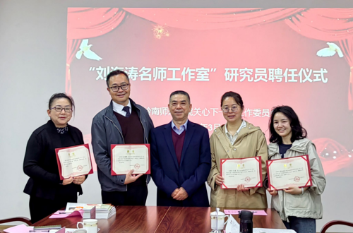会上,刘海涛为潘黎伟、杜明、肖芙、陀跃娟一一颁发“刘海涛名师工作室”研究员聘任证书。他指出,桃源小学已有114年的历史,培养了不少党史人物,红色基因浓厚。他强调,聘请桃源小学四位老师为“五老工作室”研究员,目的就是要从百年校史的红色基因中汲取强大力量,通过思政资源和学科资源在学科教师的组合、解读与挖掘下,共同研发推进一种体现以“红色文化”为抓手的“思政元素融入语文学科”新形态课程。