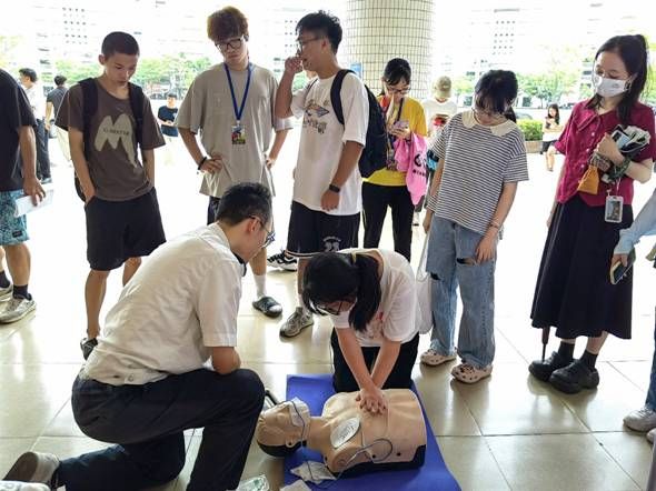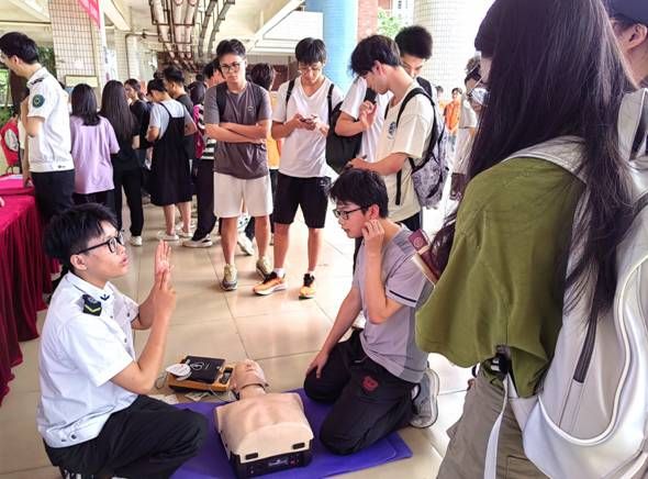 湛江市第一中医医院副院长周辉、校关工委秘书长欧海清、校团委书记林仲彦、门诊部主任梁成义等亲临现场协调组织。宣传工作组培训导师和志愿者认真地向同学们培训讲解如何拨打120急救电话,如何开展生活基本救护“心肺复苏术”“海姆利克急救法”“气管插管法”“心脏按压机操作使用”,耐心地为同学们科普中医药文化、辨识中草药等内容。同学们仔细倾听、虚心请教、踊跃参与、亲身体验心肺复苏术与海姆利克急救法,气氛热烈活跃。