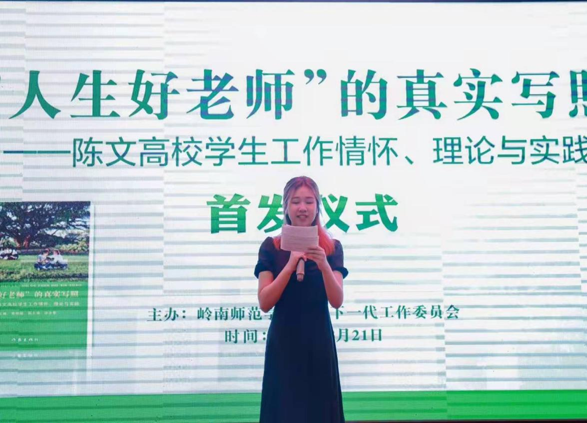 为加强学校德育工作,推动学校育人工作深入开展,学校关心下一代工作委员会于3月21日上午在弘雷楼211室举办原关工委副主任陈文老师关于学工理论和业绩新书《“人生好老师”的真实写照》首发会仪式。出席本次活动的有学校关工委领导、学校学生工作部领导、社会作家代表、作者代表、各二级学院学生等。