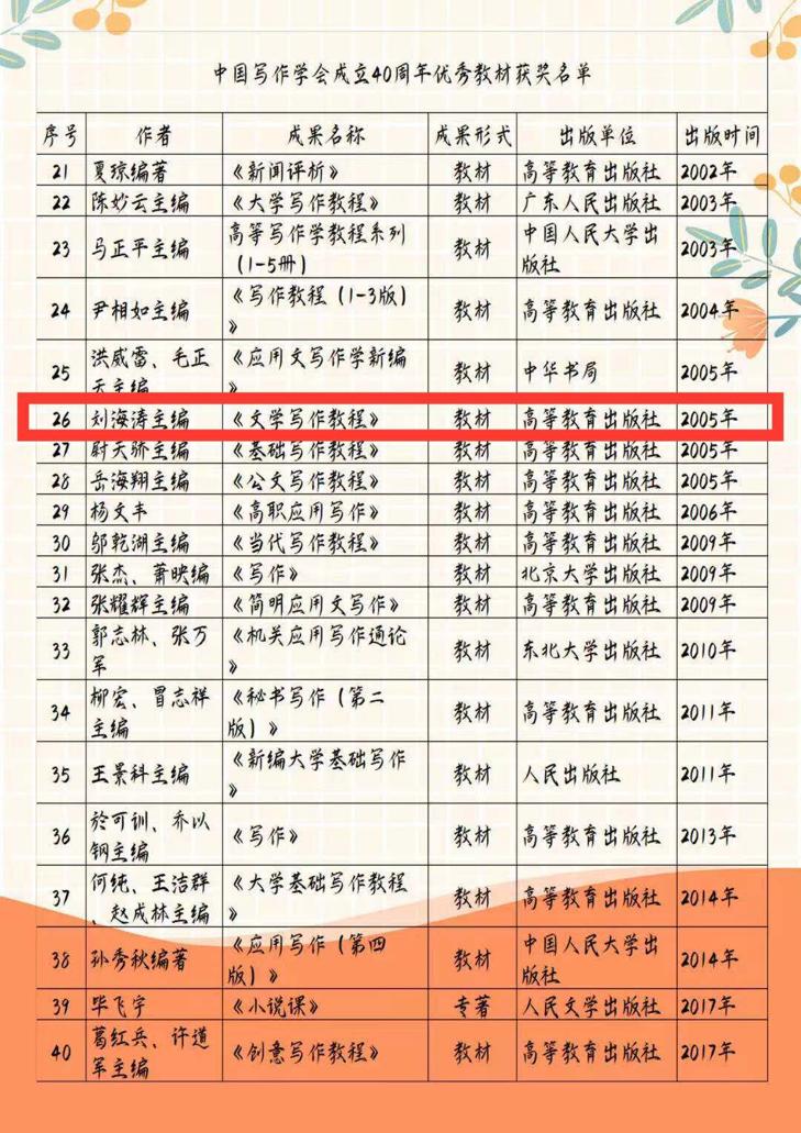春风送暖春色美,喜鹊报喜佳音至。近日,我校刘海涛教授在高等教育出版社出版的《文学写作教程》,以及董小玉教授为第一主编、刘海涛教授为第二主编的《现代写作教程》荣获“中国写作学会成立40周年40部优秀教材奖”。