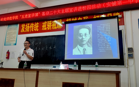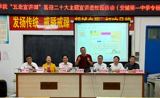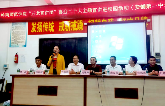 9月9日下午,岭南师范学院到廉江市安铺镇第一中学举办了“岭南师范学院‘五老宣讲团’喜迎党的二十大主题宣讲进校园活动”,讲述红色故事,传承红色精神,对青少年学生进行爱国主义教育。