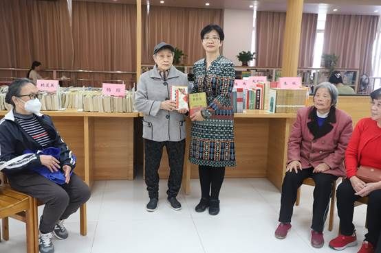 老同志代表赖莲英老师向图书馆捐赠书籍