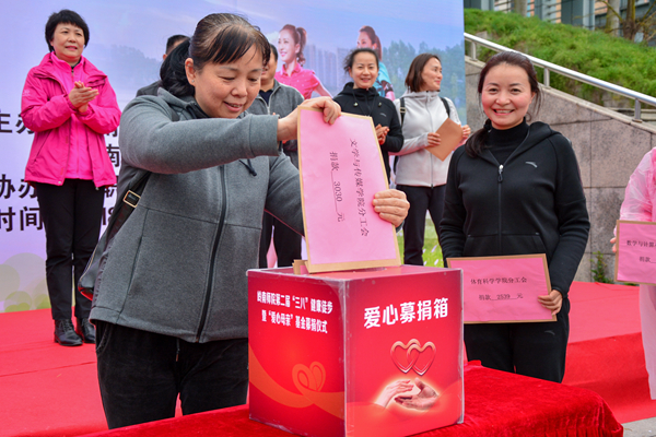 活动现场,女职工们纷纷在“爱心墙”上签名,并积极向“爱心母亲”基金捐款。兰艳泽为徒步活动发枪,300多位女工分为“开启新时代”“申硕新征程”“建功新师范”“树人新担当”“巾帼新作为”“平安新校园”六个整齐的方阵队伍健步前行。