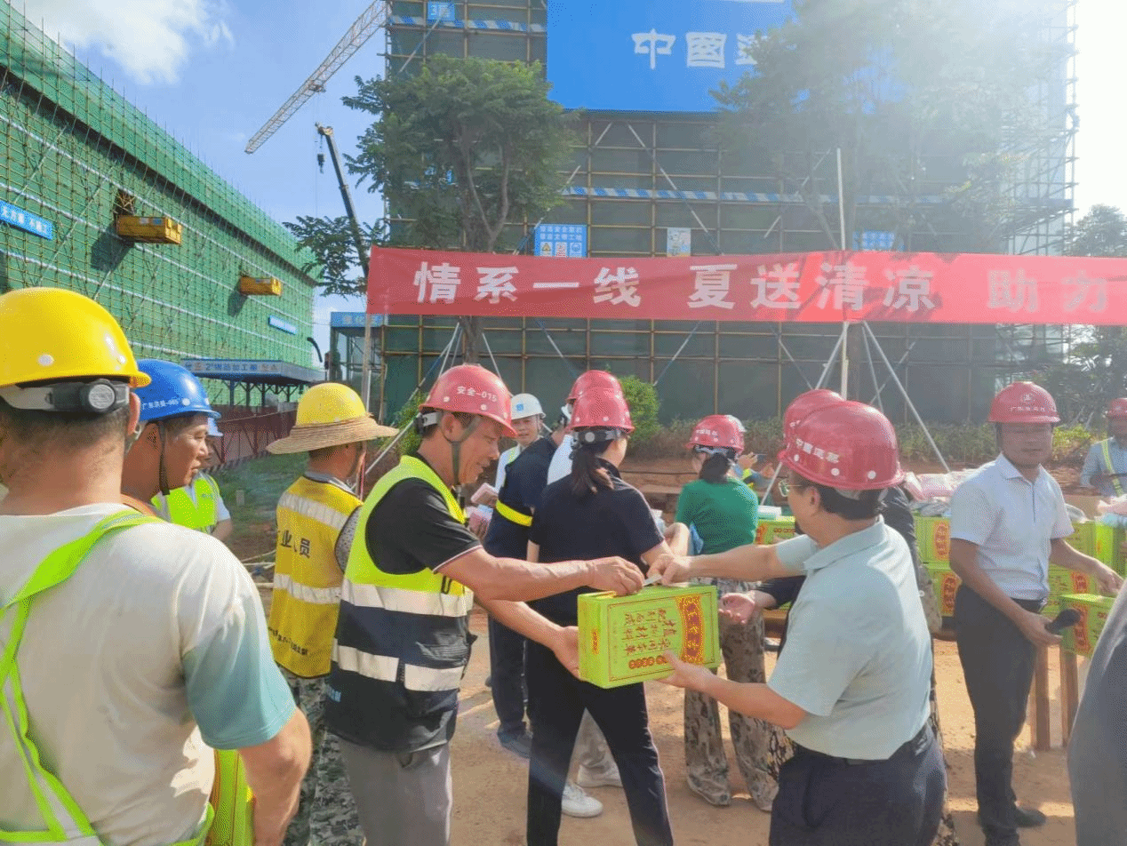“健健康康地工作,顺顺利利地推进!”6月30号下午,学校副校长苏古发率校工会党支部与校区办党支部全体党员到湖光新校区建设工地开展“夏送清凉”主题党日活动,为奋战在建设工地一线的工人送去王老吉凉茶、毛巾等慰问品,并深入施工现场,听取进度汇报、检查工程建设情况。