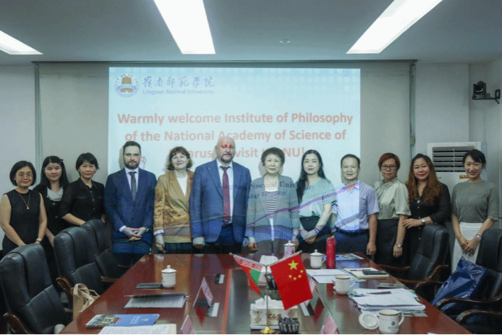 岭师新闻中心讯:5月22日下午,白俄罗斯国家科学院哲学研究院一行来访交流会议在学校二号会议室召开。我校党委书记兰艳泽、白俄罗斯国家科学院哲学研究院院长拉扎列维奇·阿纳托利·阿尔卡季耶维奇、高级研究员娜达莉亚·亚历山大罗夫娜·拉扎列维奇、我校科学研究处处长刘群慧、法政学院院长刘鑫淼、国际交流与合作处副处长陈婵娟、国际交流科科长程维婕、中国-白俄罗斯哲学文化研究中心(以下简称“中白中心”)研究员德米特里博士、陈琳琳博士、刘子莹博士、国际交流与合作处国际交流科科员李西子及翻译韩小燕等人参加会议。
