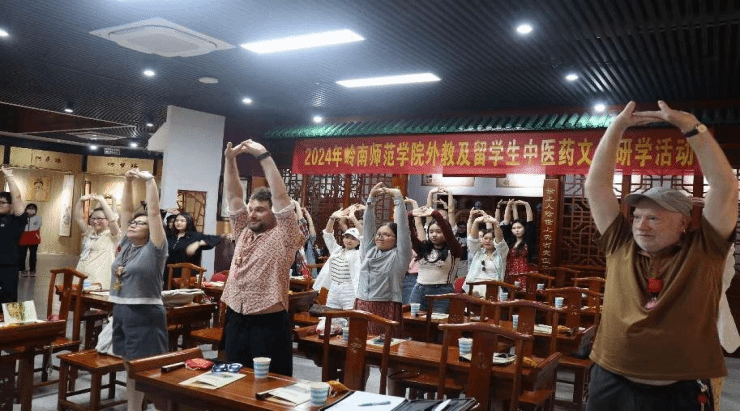 下午三点,一行人抵达了湛江市中医学校,首先聆听了一场中医健康知识的英语讲座。讲师向在座的外籍教师及留学生介绍了中医药的由来和发展历程,并简述了日常的中医养生方法。随后,在讲师的带领下在场所有外籍教师与留学生共同体验养生保健操——八段锦。