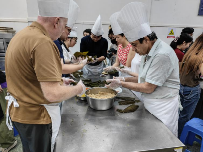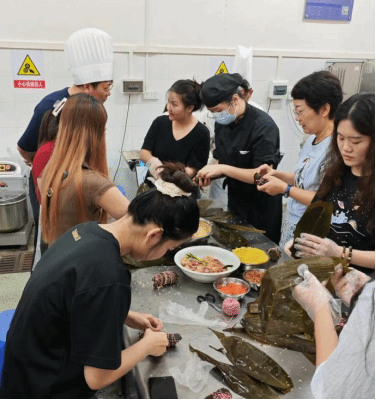 2024年6月7日,临近端午佳节,为丰富我校外籍教师与留学生在校文化生活,进一步感受我国端午佳节氛围,应我校食品与科学工程学院邀请,在国际交流与合作处处长郑志军的陪同下,我校外籍教师、留学生一行前往我校鹏园实训室开展端午包粽子文化体验活动。