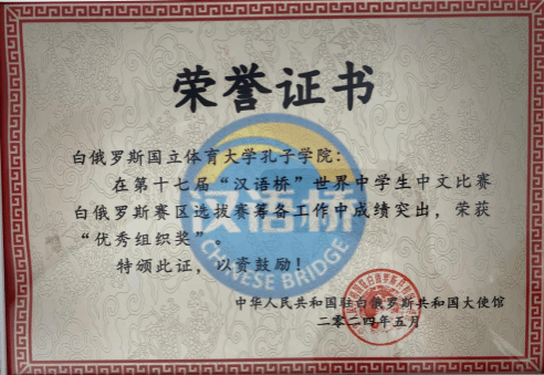 2024年6月6日,备受瞩目的第十七届“汉语桥”世界中学生中文比赛白俄罗斯赛区选拔赛,在庄重的白俄罗斯国立体育大学学术报告厅圆满落幕。此次比赛由中华人民共和国驻白俄罗斯共和国大使馆精心主办,并由我校与白俄罗斯国立体育大学合办的白俄罗斯国立体育大学孔子学院(以下简称“白体大孔院”)承办。本次选拔赛的成功举办,不仅彰显了中华文化的魅力,也进一步推动了中白两国在教育领域的交流与合作。白俄罗斯国立体育大学第一副校长克利诺夫·夫拉季米尔,以及中国驻白俄罗斯大使馆科教文处二等秘书胡云波、三等秘书贾伟等重要嘉宾均莅临现场,共同见证了这一文化盛事。