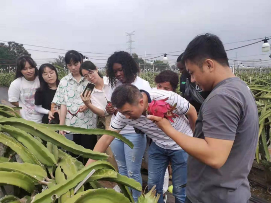 留学生一行还参观了城月镇佛雷农场种植园。在种植园中,佛雷农业集团庞俊杰总经理向师生们介绍了现代化大农场中种植番薯、藿香、火龙果等作物的特点及优势。工作人员为师生们展示了现代农业中的无人机管理技术。通过无人机飞行打药等演示,留学生们深切感受到了先进技术在现代化农业中的巨大作用。庞俊杰总经理介绍说:“当前我们的无人机技术在全世界都是处于领先行列的,以眼前这一款无人机为例,它的最大载重为三十公斤,可以替代五十个工人在农田中进行劳作,极大提高现代化农业生产效率。”听到这里,留学生们致以了热烈的掌声,纷纷表示这一次学习考察让他们大开眼界,切身感受到了中国现代化农业的魅力,他们希望有一天可以把这些先进的技术带回自己的国家。