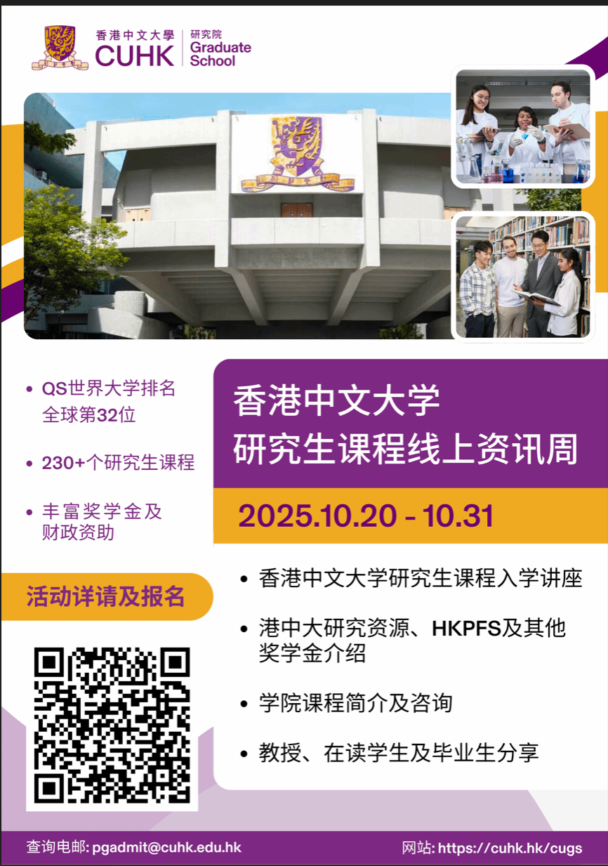 此外,港中大研究院将于2025年10月20日至10月31日举办香港中文大学研究生课程在线信息周,分享有关2026-2027学年研究生课程的入学要求及其他有用升学信息。个别学院亦会举办专题讲座,提供不同学科的详细入学信息。