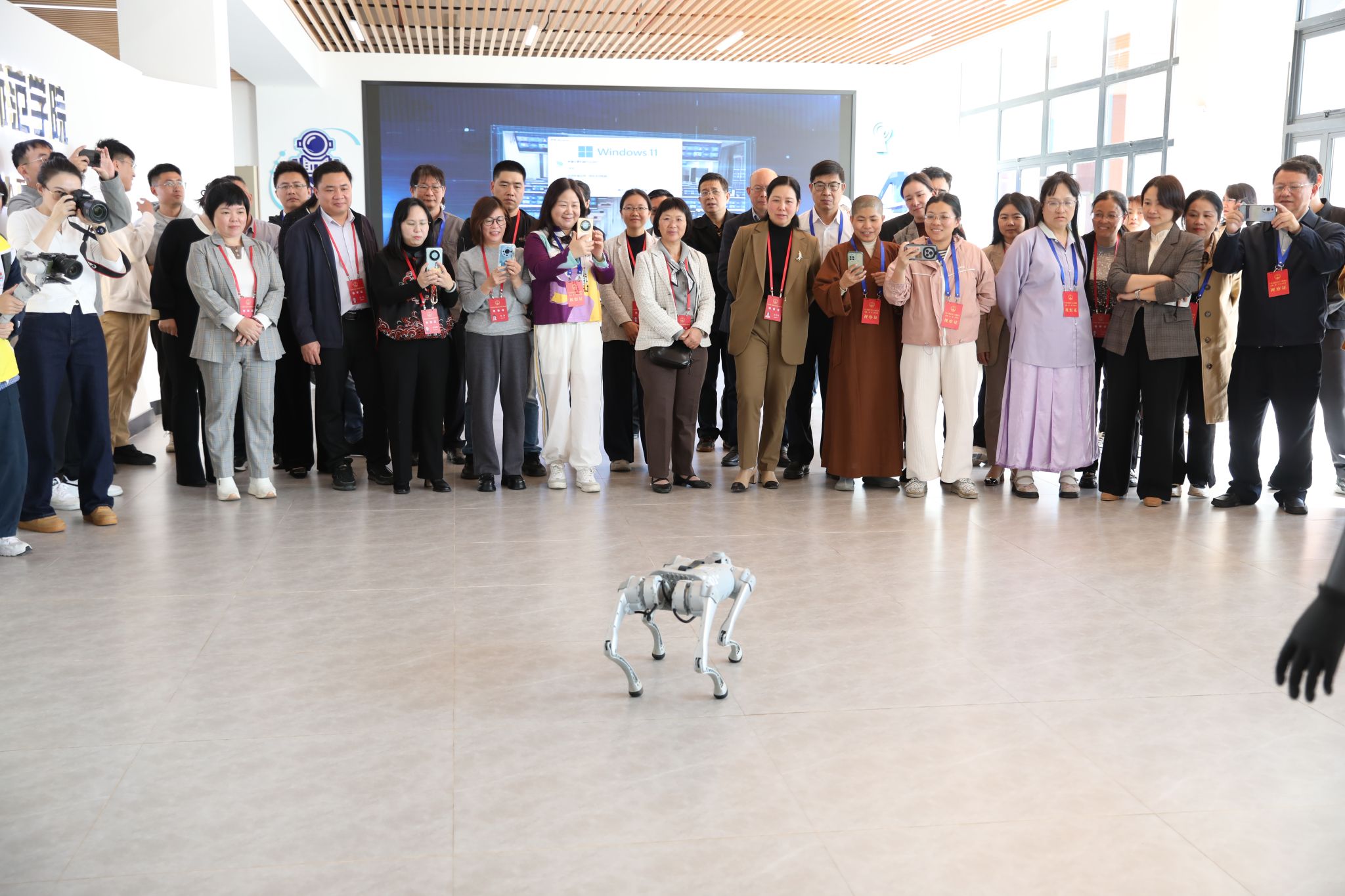 代表们观看机器人、机器狗、无人机等功能展示