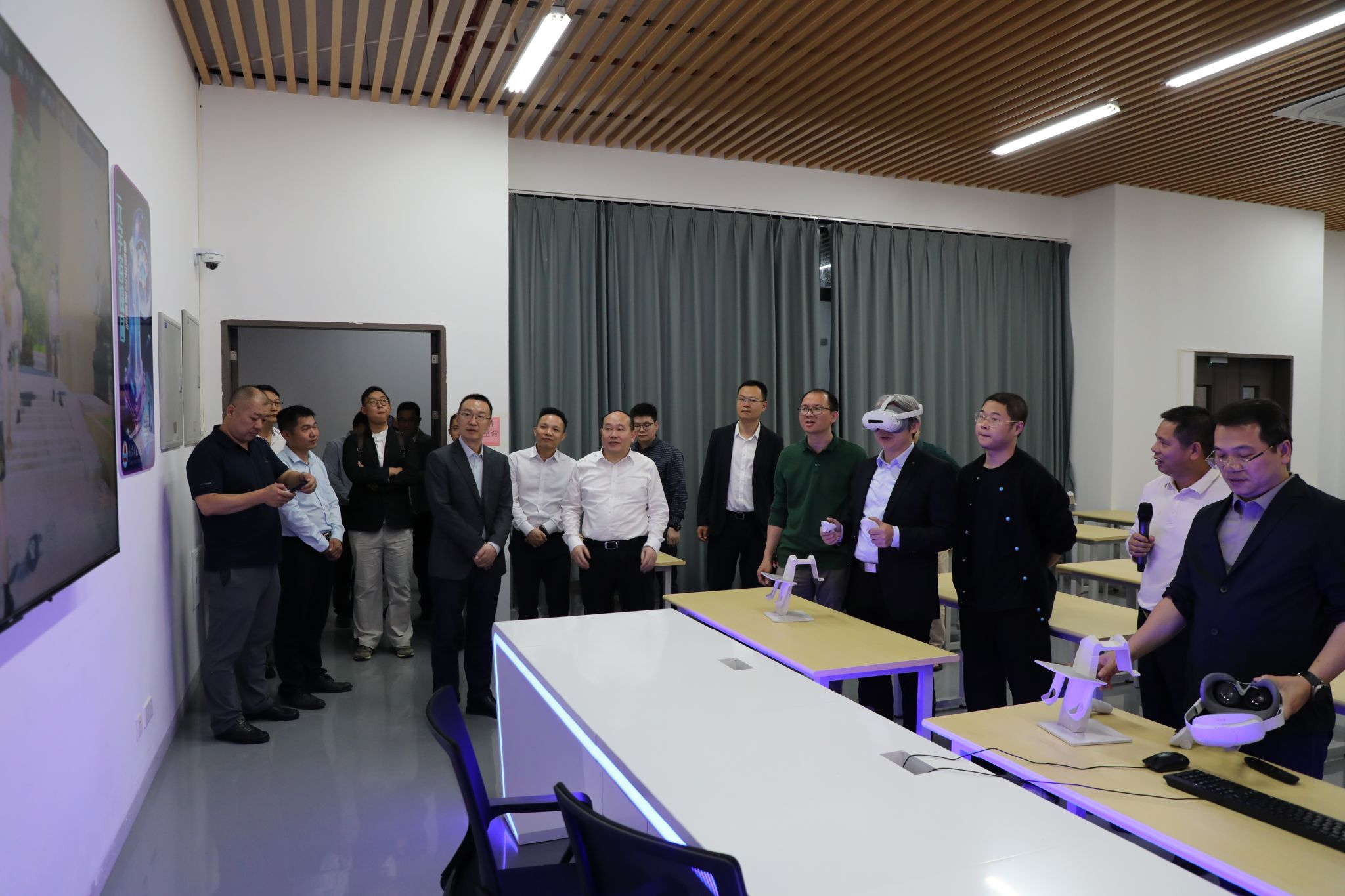 省工业和信息化厅总经济师邹勇兵、中山大学教授胡海峰、广东技术师范大学校长金义富,以及湛江市政务和数据局党组书记、局长胡小军等考察团成员通过听取介绍、观看视频、实地走访参观以及沉浸式体验“元宇宙校园”等,详细了解了岭南师范学院人工智能应用创新实训中心建设运营、AI 教学应用、数字化转型成效及产教融合特色。考察团对岭南师范学院在 AI 人才培养、平台建设、服务地方发展等方面的成果给予高度评价。