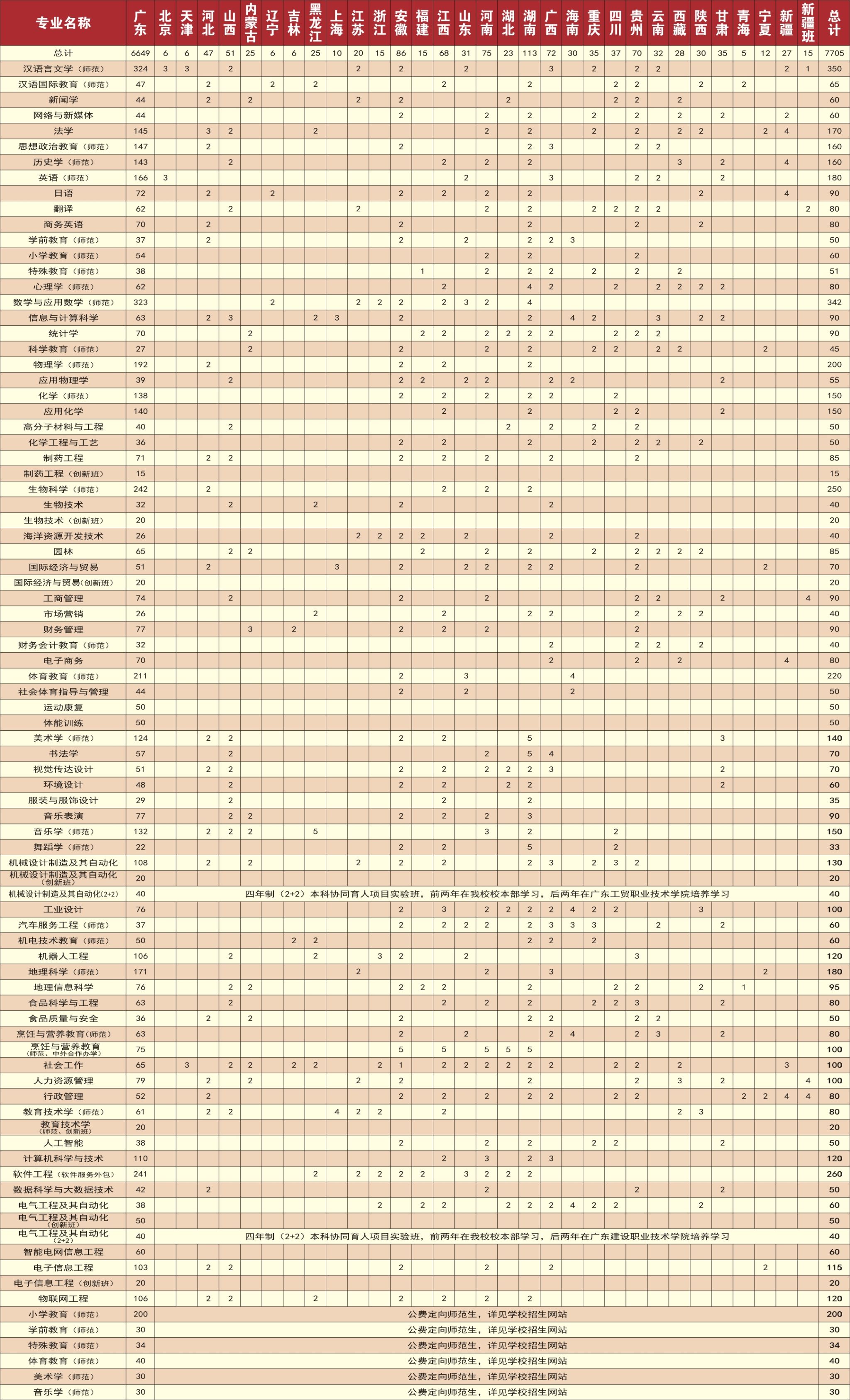 答:我校公费师范生本科专业在广东本科提前批录取,其他本科专业在本科批录取,具体以各生源省份招办公布的专业目录为准。我校2023年本科面向广东、北京、天津、河北、山西、内蒙古、辽宁、吉林、黑龙江、上海、江苏、浙江、安徽、福建、江西、山东、河南、湖北、湖南、广西、海南、重庆、四川、贵州、云南、西藏、陕西、甘肃、青海、宁夏和新疆31个省(市、自治区)招生。