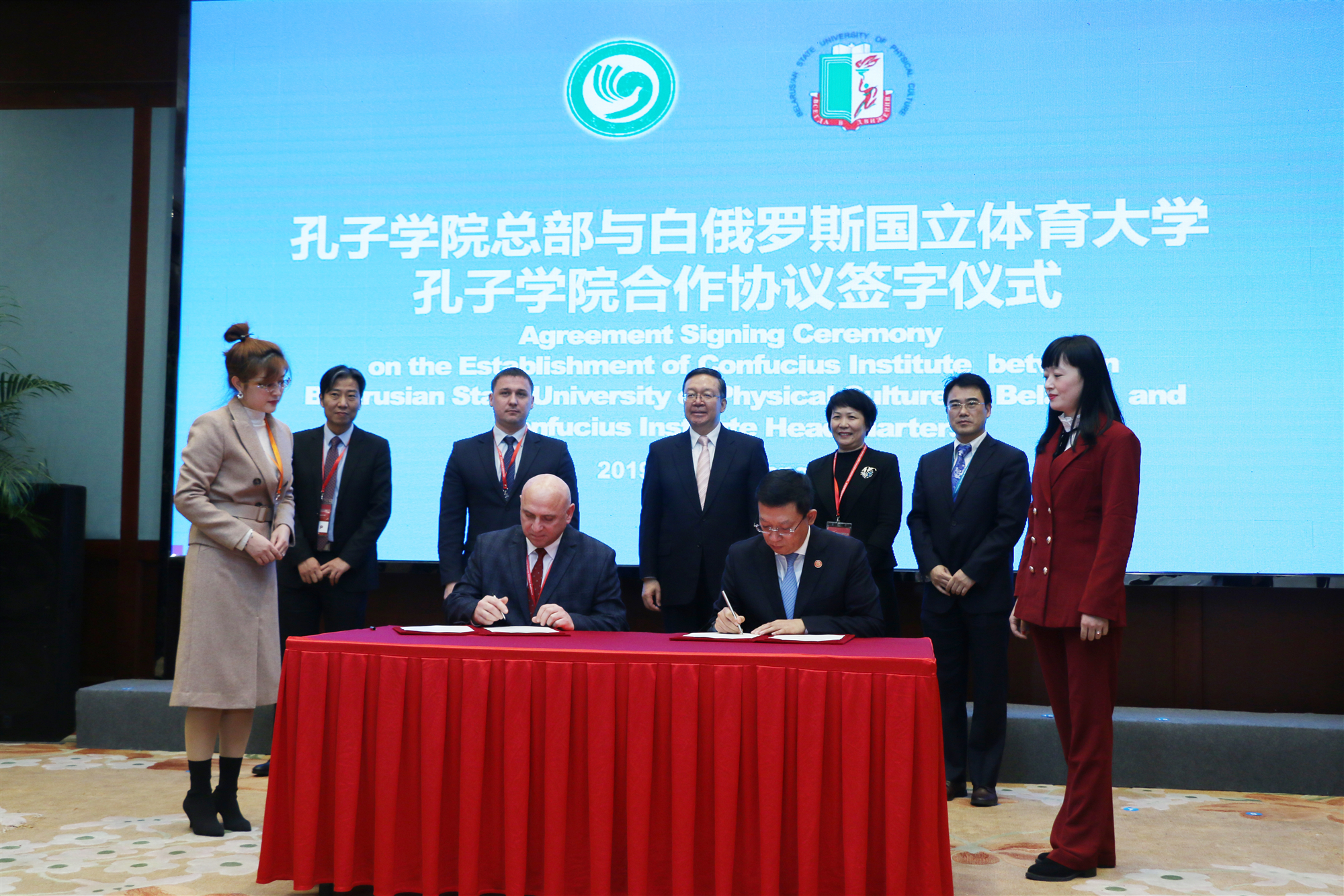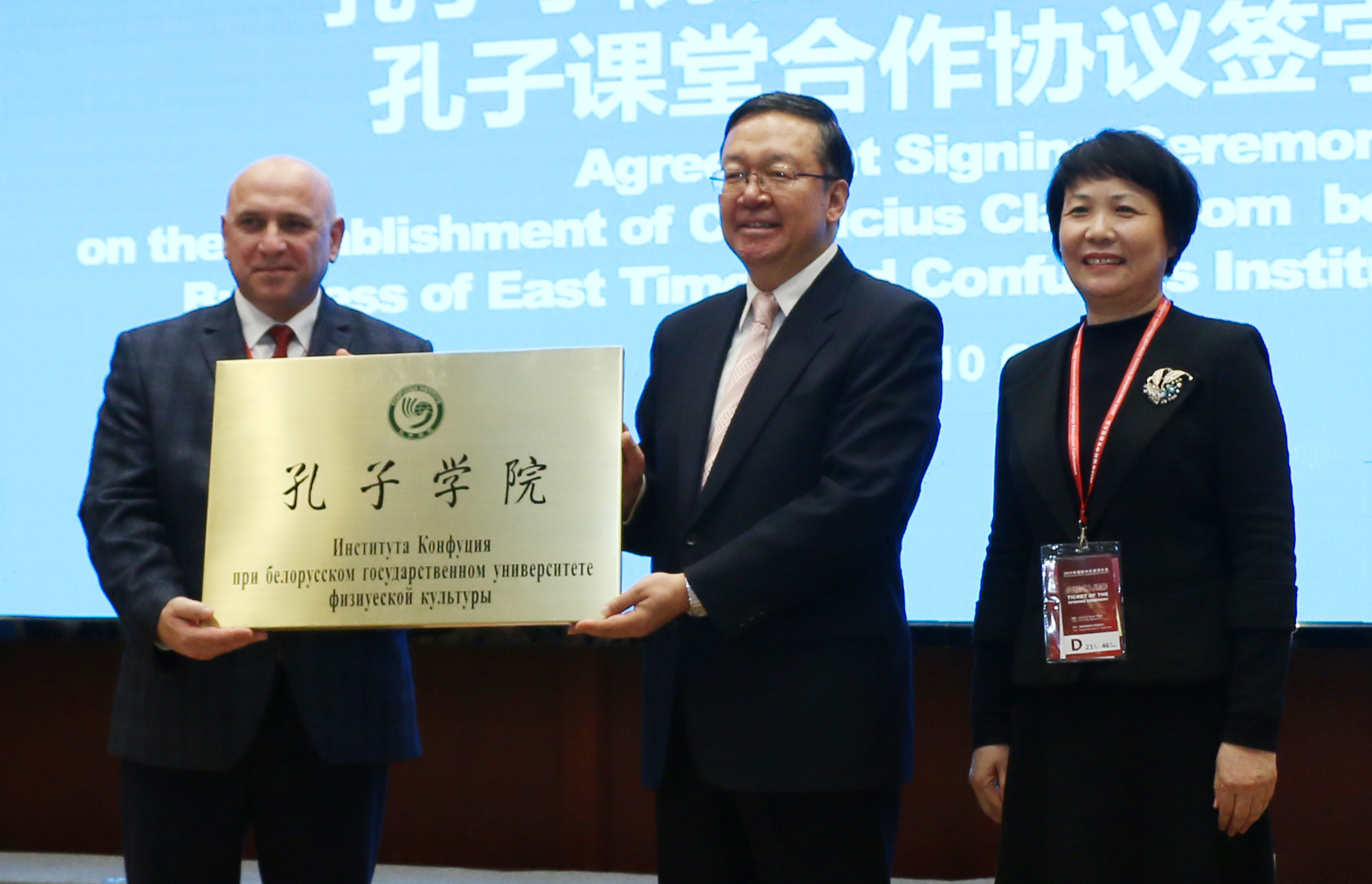 岭师新闻中心讯:12月10日下午,在长沙由国家汉办举办的2019年国际中文教育大会的现场,中国教育部副部长田学军、岭南师范学院校长兰艳泽、副校长戴黍和白俄罗斯国立体育大学副校长弗拉基米尔•克林诺夫等领导和嘉宾共同见证,孔子学院总部副总干事马箭飞与白俄罗斯体育旅游部第一副部长维亚切斯拉夫·杜尔诺夫正式签署孔子学院合作协议。田学军向维亚切斯拉夫•杜尔诺夫和兰艳泽授牌,由我校与白俄罗斯国立体育大学合办的孔子课堂升格为孔子学院。