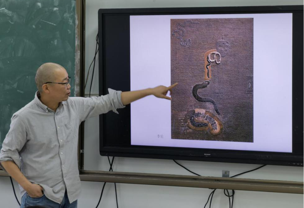 李小军给学员们讲授了漆画的特色创作。他表明了关于漆画创作的独到见解一一创作漆画应当遵循其纯艺术多元化的特色,在创作的过程中培养自我的创新精神和持续研究能力,掌握较高漆艺专业技能,能从事平面漆画创作和漆立体创作,具备多方面从设计应用到产品开发能力的复合型专业人才。这也是李小军对本次国培学员们的殷殷期盼。