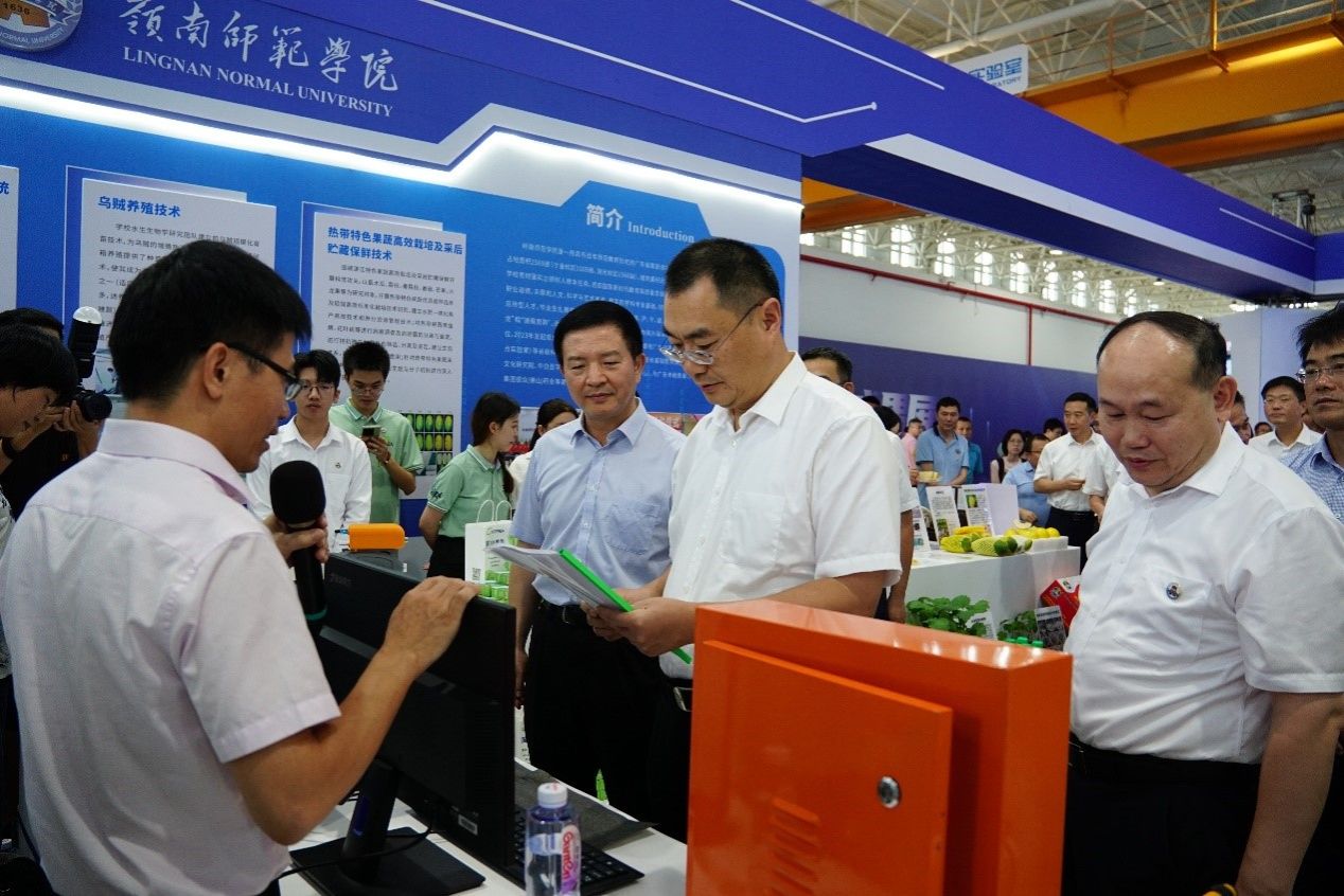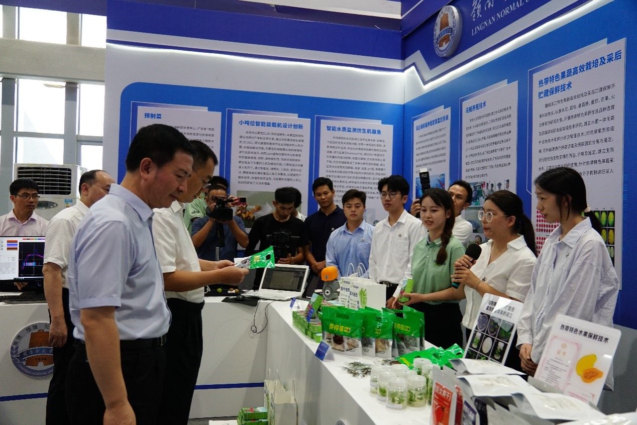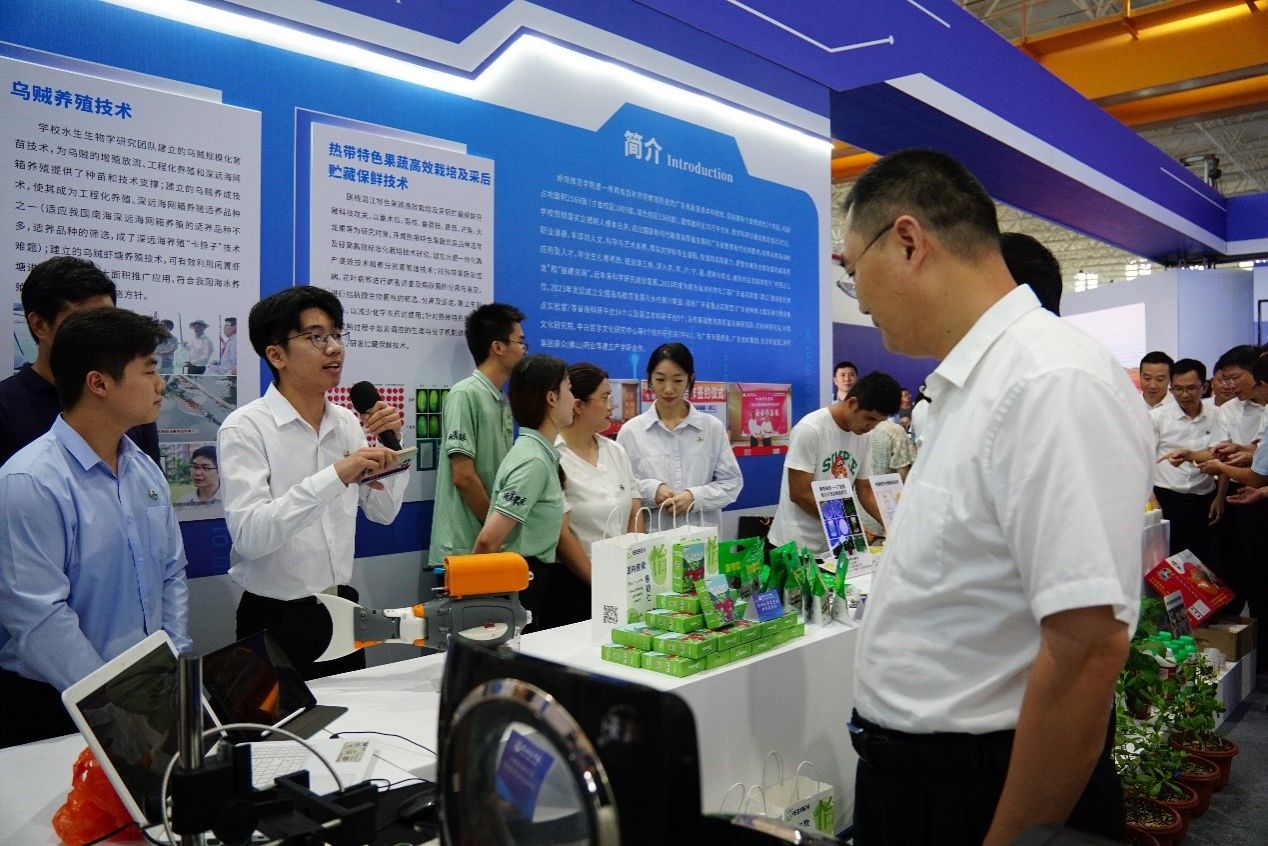 会前,学校相关成果团队负责人或成员向与会领导介绍科技成果。市委书记刘红兵、市长曾进泽等在阳爱民校长的陪同下,对学校参展成果进行了一一的了解,并给予了充分的肯定。刘锴栋团队着重介绍了热带特色果蔬高效栽培及采后贮藏保鲜技术。项立团队介绍了新型农药喷洒智能设备。黄丽平团队介绍了高良姜高值化产品研发。陈小军团队介绍了智能水质检测仿生机器鱼。其他团队或成员分别介绍了贝类重金属污染快速检测仪、电饭煲检测仪,智慧农场检测仪,智能消毒仪,春砂仁养胃系列新资源食品等科研成果。