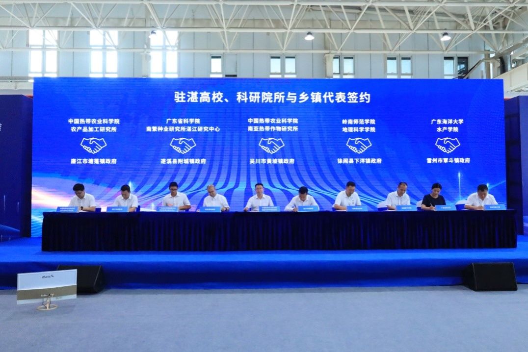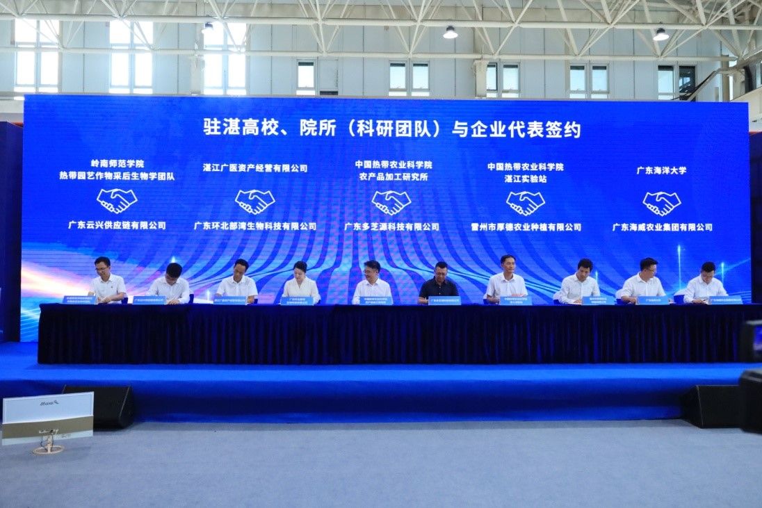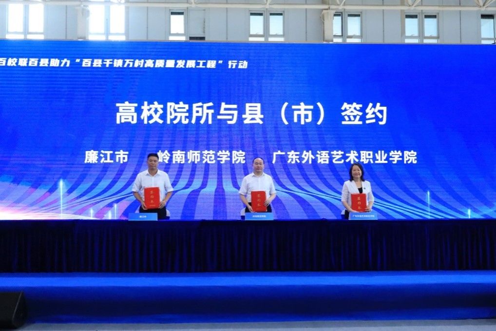 在“双百行动”高校院所与结对县(市)签约环节,协同广东外语艺术职业学院,阳爱民代表学校与廉江市进行现场签约,加强与廉江市在产业发展、城乡建设规划、基本公共服务等领域合作共建,助力全面推进乡村振兴、推动县域经济高质量发展。阳校长表示,下一步,学校将以习近平新时代中国特色社会主义思想为指导,全面贯彻落实党的二十大精神,围绕“百千万工程”目标要求,在新时代新征程上,学校将聚焦贯彻落实省委“1310”战略部署,认真落实“双百行动”,强化产学研深度合作,争取更多的科技成果“落地生金”,为广东全面推进乡村振兴、推动区域高质量发展输出更多“岭师智慧”。在驻湛高校、院所(科研团队)与企业代表签约环节,我校与广东云兴供应链有限公司签署合作协议;在驻湛高校、科研院所与乡镇代表签约环节,我校与徐闻县下洋镇政府签署合作协议。