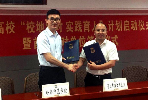 实践育人”计划启动仪式暨首批结对单位签约仪式在华南师大举行,我校党委副书记黄达海代表学校与廉江市政府副市长张子石签订了《校地共建实践育人基地协议书》。