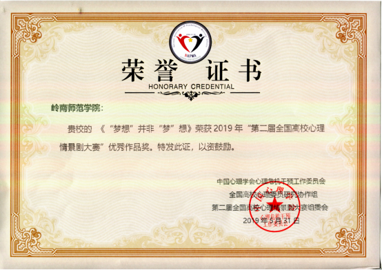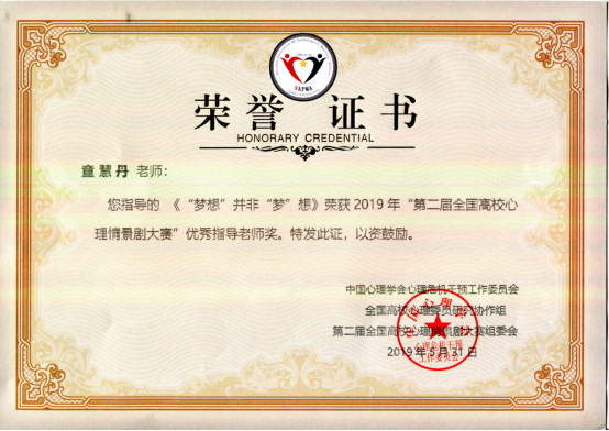 5月31日,第二届全国高校心理情景剧大赛决赛在西安电子科技大学落幕。我校选送的作品《“梦想”并非“梦”想》获优秀作品奖,童慧丹老师荣获优秀指导老师奖。