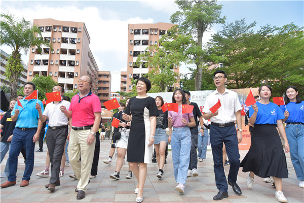 师生齐唱《我和我的祖国》走在迎新的现场(赵博也摄)