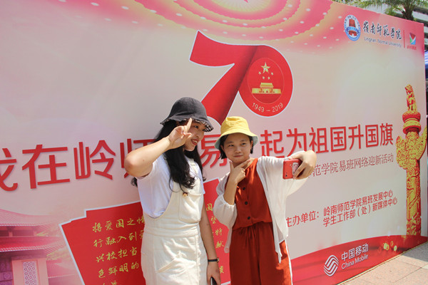 迎新现场,新生争相在“我在岭师‘易’起为祖国升国旗”主题宣传墙前向祖国告白,踊跃参加“易班有礼,与旗同框”国情校情有奖知识问答等活动。