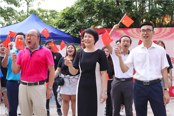 “突如其来”的快闪点燃了现场师生的热情,岭南师院校长兰艳泽、党委副书记黄达海等校领导,也情不自禁地加入到“快闪”之中,他们与现场师生一起挥舞着小国旗唱了起来。现场越来越多的学生围聚过来,拿出手机边拍摄边参与其中,大家纷纷跟着节拍大声地唱了起来,让报到的新生和家长感到格外的亲切。