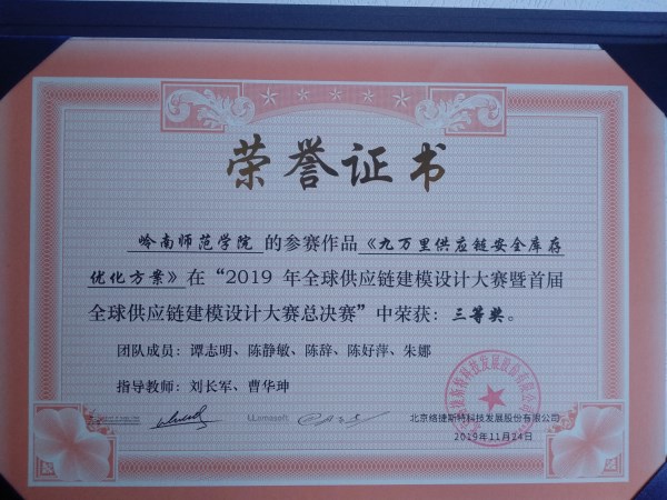 11月23至24日,由供应链管理专业协会cscmp(council of supply chain management professions)中国主办、西南交通大学承办的“2019首届全国供应链建模设计大赛总决赛”在成都圆满闭幕。在本次比赛中,在刘长军、曹华珅两位指导老师的带领下,由我校商学院学生谭志明、陈静敏、陈辞、陈好萍和朱娜5名学生组成的“九万里队”,在总决赛激烈对抗方案演说中取得全国三等奖和最佳组织奖的成绩。