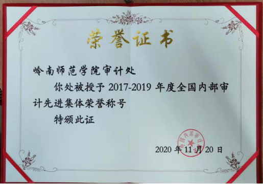 11月25日,中国内部审计协会发布“关于表彰2017-2019年度全国内部审计先进集体和先进工作者”的决定,岭南师范学院审计处被授予“全国内部审计先进集体”荣誉称号。