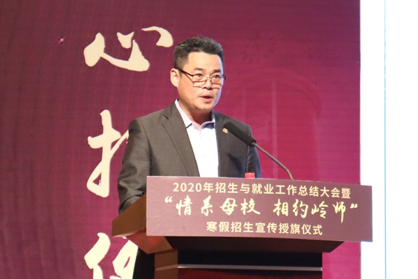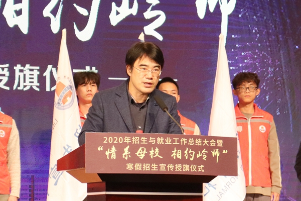 岭师新闻中心讯:12月23日,2020年招生与就业工作总结大会在音乐厅召开。副校长戴黍为寒假招生宣传队长们授旗,正式启动2021年“情系母校,相约岭师”寒假招生宣传工作。招生与就业处副处长周明俊主持会议。