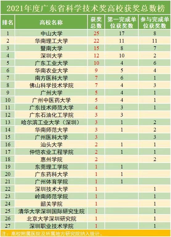2021年广东省科学技术奖高校获奖统计