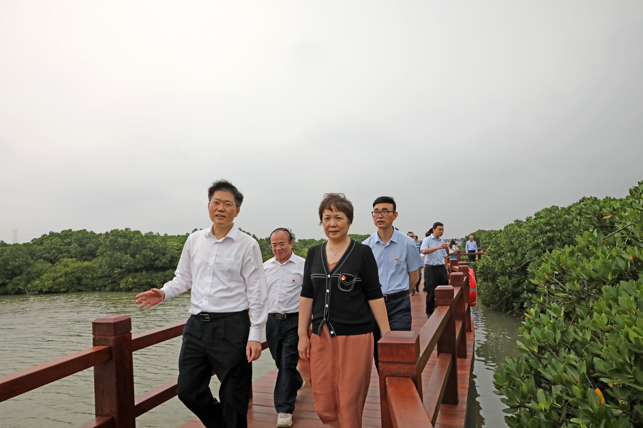 登上朱红的栈道,一片茂密的红树林呈现在大家眼前,鸟儿时而翱翔在海洋上空,时而在红树林枝头小憩。麻章区委书记陈政向兰艳泽一行热情介绍了金牛岛红树林片区的概况,深情回忆了习近平总书记在这里视察时的感人时刻。“在全国上下深入贯彻党的二十大精神的重要时刻,在新征程开局起步的关键节点,习近平总书记亲临广东视察,第一站就来到湛江,这是湛江发展历程中具有里程碑意义的大事、喜事。”陈政激动万分地说。