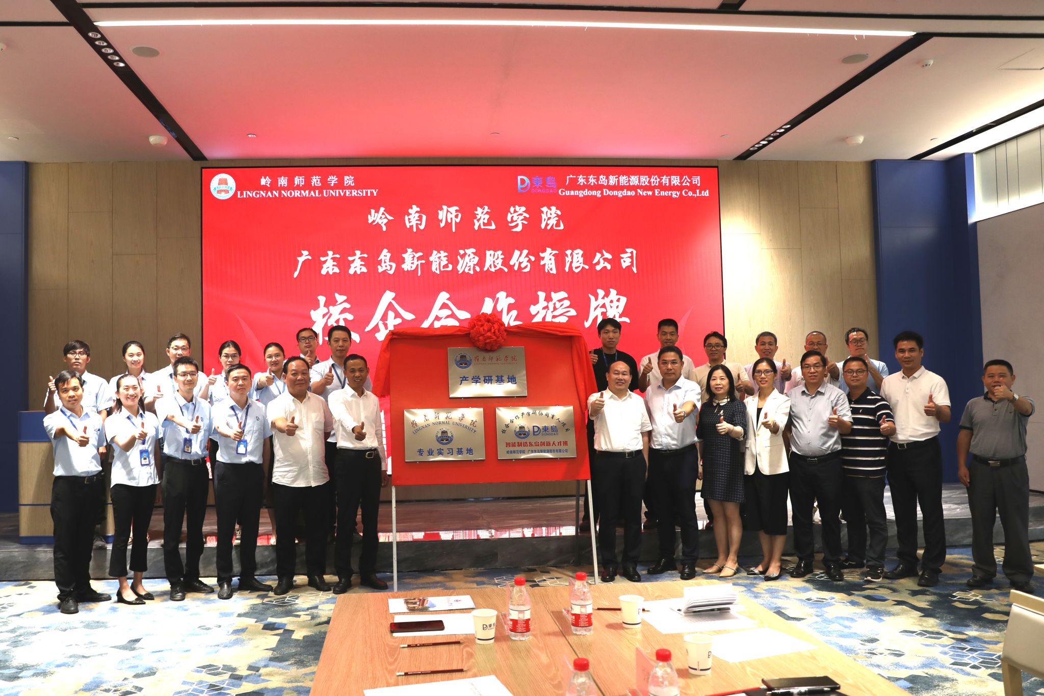 当日,岭南师范学院与广东东岛新能源股份有限公司(简称东岛公司)校企合作签约仪式在东岛公司一楼报告厅举行。岭南师范学院校长阳爱民、广东东岛新能源股份有限公司董事长吴其修在双方合作协议上签字后,迈向主席台和校企专家教授一起,共同为“校企合作产学研协同育人项目——智能制造东岛创新人才班”“岭南师范学院产学研基地”“岭南师范学院专业实习基地”揭牌。