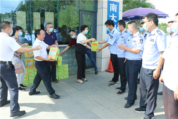 来到学校南大门,兰艳泽、苏古发将慰问品发放到一线安保人员手中,详细了解大家的工作环境和生活情况。兰艳泽说,为了做好疫情防控工作,暑假期间学校继续实行校园封闭式管理,正值高温天气,大家依然坚守岗位,我们代表学校感谢大家,希望大家暑假期间疫情防控和校园安全工作一定不能放松,同时注意劳逸结合,做好防暑降温措施。一线安保人员表示,有领导的关心关怀,一定会把好学校的入门第一关,保证校园安全。