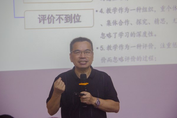 讲座伊始,冯铁山教授提出“什么是单元整合教学?”“单元整合教学的本质是什么?”“单元整合教学要怎样设计与操作?”引发了在座的老师和同学们的思考。冯教授认为语文教学观念需要进行一次革故鼎新的改革。冯教授运用阶梯式的教学方式讲解单元整合教学,通过分析语文日常教学存在的问题提出“教师应具有单元整合意识”的建议,提倡以立体思维进行语文教学,尊重学生人格的立体性,开发学生思维。