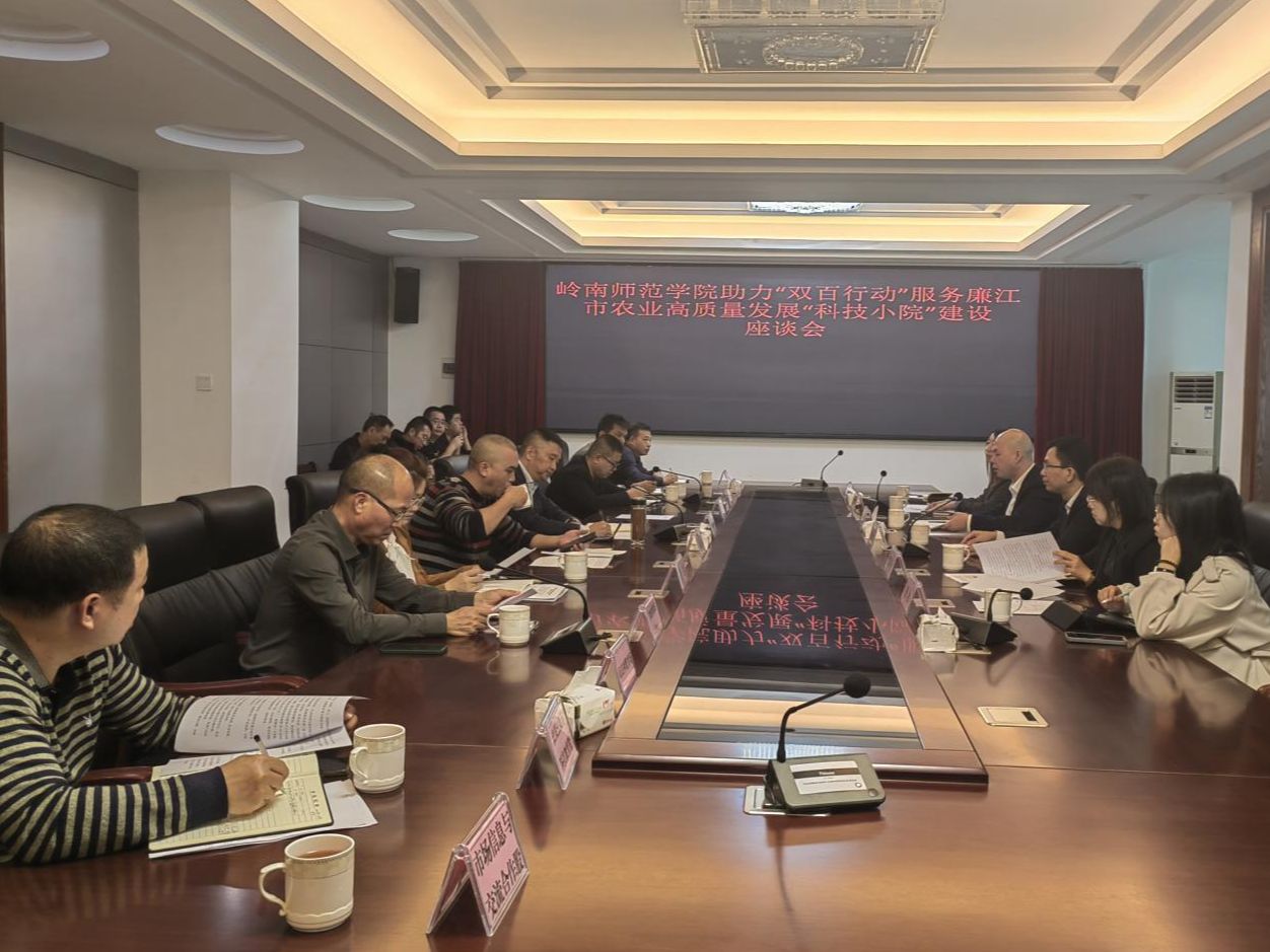 为深入贯彻落实省委、省政府关于实施“百千万工程”决策部署,全面落实省百校联百县助力“百千万工程”行动工作要求,助力廉江市地方经济发展,1月18日,生命科学与技术院院长刘锴栋一行赴廉江市走访调研,并在廉江市农业农村局会议室就“科技小院”建设工作进行座谈交流。岭南师范学院校长办公室副主任(校地办主任)、驻廉江市服务队队长钟召春主持会议。廉江市农业农村局党组副书记梁永健,廉江市委农办常务副主任、廉江市农业农村局党组成员、廉江市乡村振兴局常务副局长肖发年,廉江市乡村振兴局常务副局长张琼、丘佳圣,廉江市农业发展中心、廉江市农业技术推广中心负责人、生命科学与技术学院党委副书记覃静君,生命科学与技术学院副院长王锂韫,生物科学系主任周艳,生物科学系李晓菲参加会议。