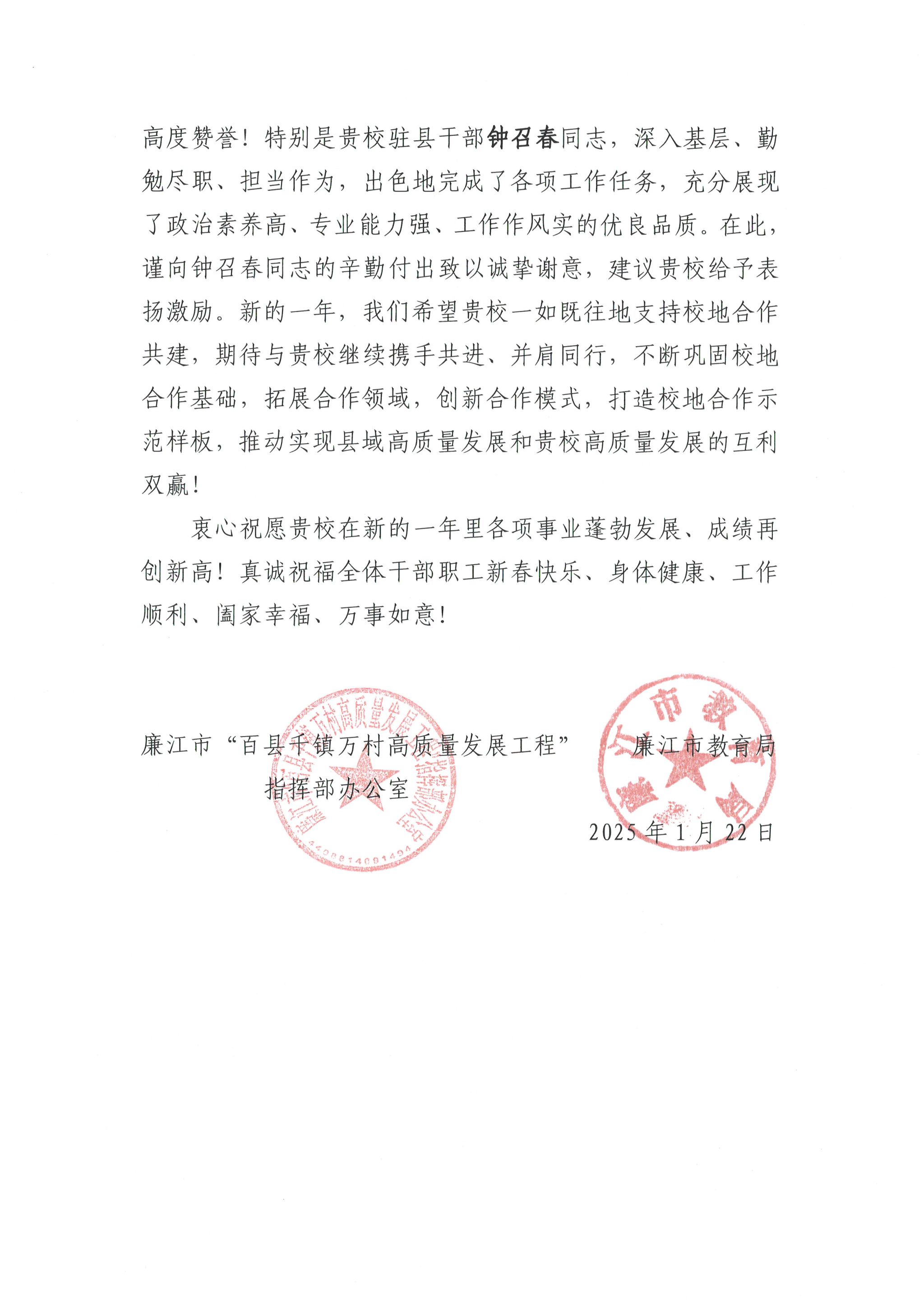 感谢信特别提到,岭南师范学院驻县干部钟召春同志,深入基层、勤勉尽职、担当作为,出色地完成了各项工作任务,充分展现了政治素养高、专业能力强、工作作风实的优良品质。谨向钟召春同志的辛勤付出致以诚挚谢意。
