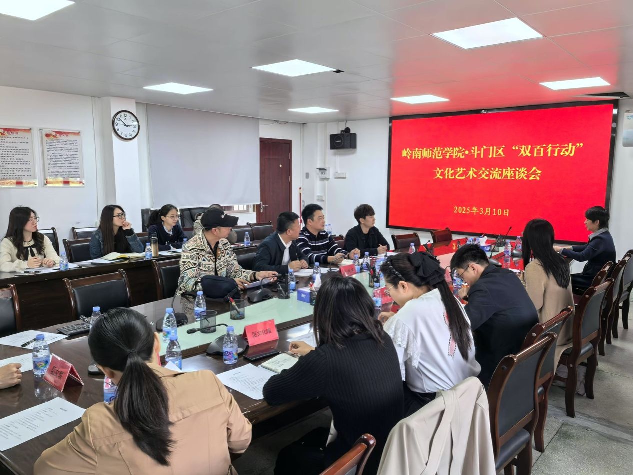10日下午,校地文化艺术交流座谈会在斗门区机关大院1号楼501会议室举行。会议由斗门区委宣传部副部长周翠兰主持,张洪军、郑晓辉、斗门镇党委委员李超、副镇长周海军及区文化单位相关负责人出席会议。周翠兰指出,当前正值斗门区创建省级全域旅游示范区的关键阶段,亟需高校专业力量赋能文化软实力建设。张洪军系统阐释了"双百行动"的战略背景与实施路径,强调要依托斗门丰富的非遗文化资源深化校地合作。