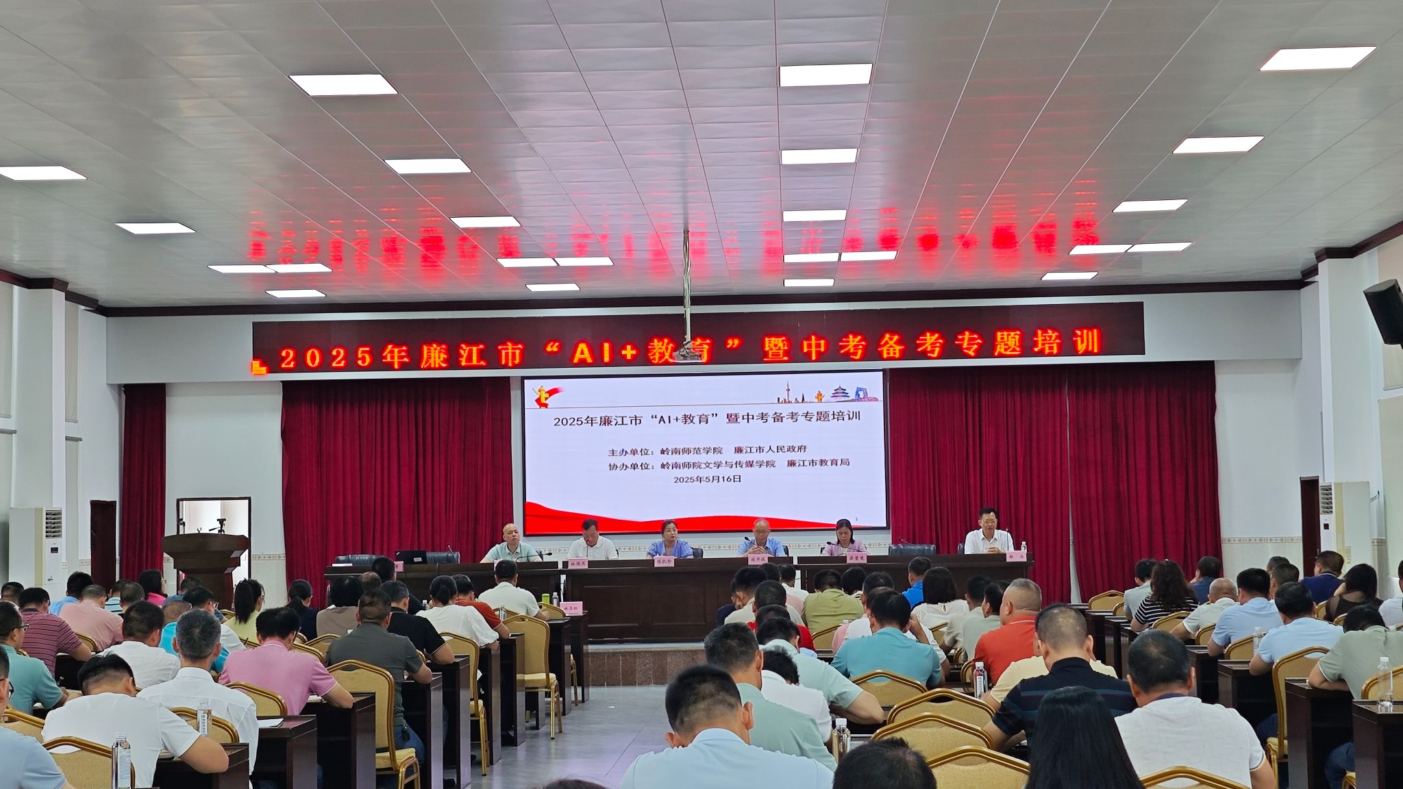 5月16日,由岭南师范学院与廉江市人民政府主办,岭南师范学院文学与传媒学院及廉江市教育局承办的“2025年廉江市‘AI+教育’暨中考备考专题培训会”,在廉江市教育局、廉江中学和廉江三中顺利举办。廉江市各初中学校近700名中考科目(语文、数学、英语、物理)骨干教师,以及各中小学校200余名教学副校长和教导主任参与了此次培训。