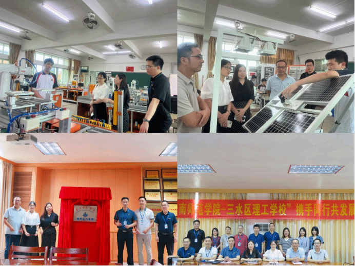 在佛山市三水区理工学校,黄展一行受到了该校党总支书记连赞强、校长叶家明、副校长徐胜的热情接待。连赞强致欢迎辞,高度肯定了我校人才培养质量,简要介绍了我校毕业生在该校成长情况,并衷心期盼两校能进一步在人才培养、职业教育培训、学生学科竞赛、实习就业等方面加强合作。徐胜从基本情况、专业发展、校企合作、人才培养成效等方面介绍了理工学校,黄展介绍了学校、学院的发展历程、办学规模、师资力量、专业设置、科研成果、人才培养和2024届毕业生就业情况等。双方共同为“岭南师范学院教育实习基地”揭牌,并在顶岗实习、毕业生就业、师资培训、科学研究等方面达成合作共识。会后,黄展一行参观走访了该校各专业实验室和实训车间、竞赛基地等。