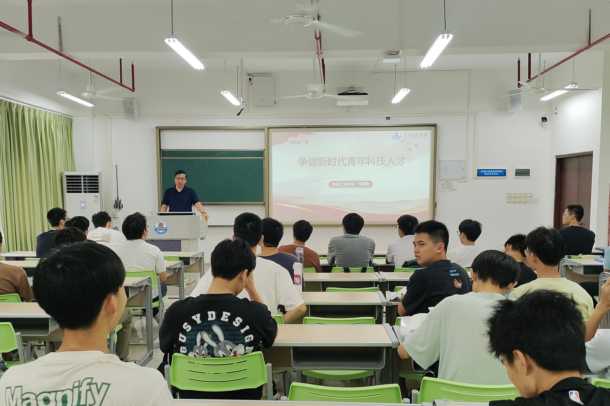 10月16日,机电工程学院院长弓满锋教授在第五教学楼C栋503教室为学院2023级智能制造创新班的学生们带来以《争做新时代青年科技人才》为题的“思政第一课”,引导同学们筑牢理想信念根基,强化责任担当精神,在吃苦中奋斗成长,做新时代敢为、有为的青年科技人才。