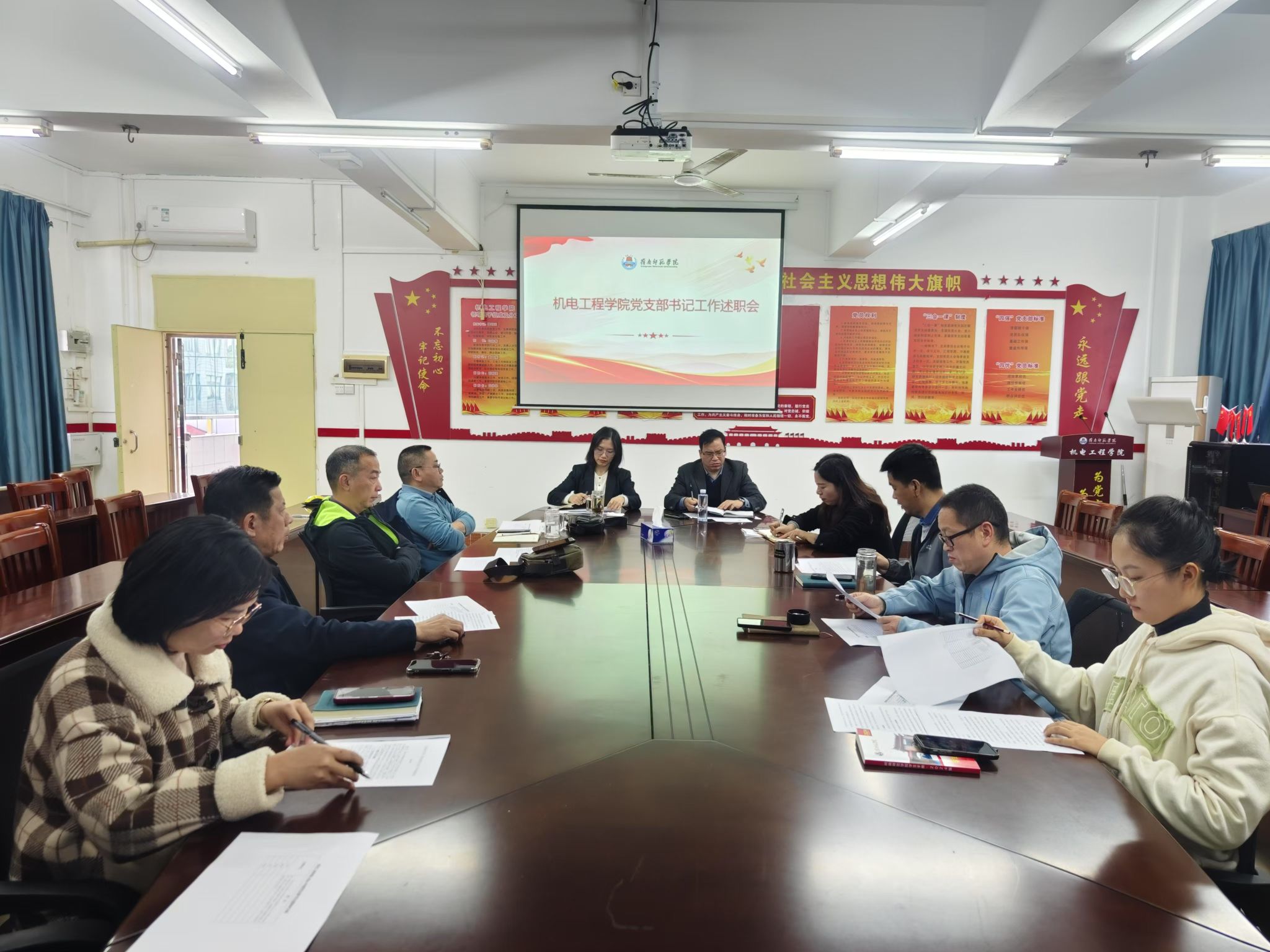12月30日,机电工程学院党委于教二401会议室召开2024年度党支部书记述职评议会,总结过去一年各党支部书记抓支部建设取得的成效和存在的问题,为接下来加强基层党支部建设做好总结和规划。学院领导班子成员、组织员以及各党支部书记参会,会议由学院党委书记莫琼玉主持。