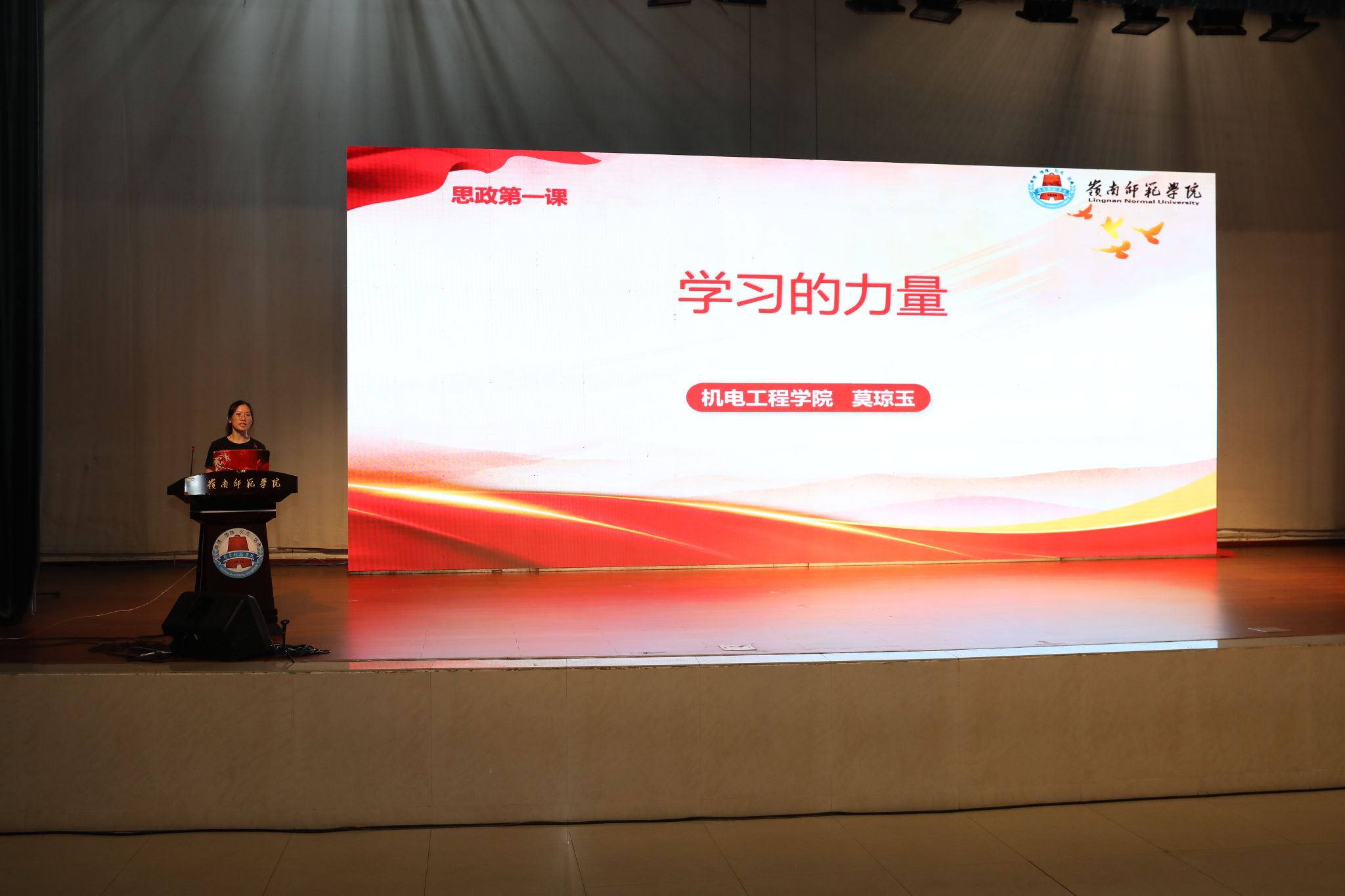 9月16日上午,机电工程学院党委书记莫琼玉在音乐厅为学院2021级专插本新生和2023级新生讲授题为“学习的力量”的“思政第一课”,引导同学们要在新的起点上树牢科技报国志,以学习为本,加强实践,优化知识结构、加快知识更新,积极拓宽眼界和视野,刻苦钻研,勇攀高峰,在推进强国建设、民族复兴伟业中绽放青春光彩。