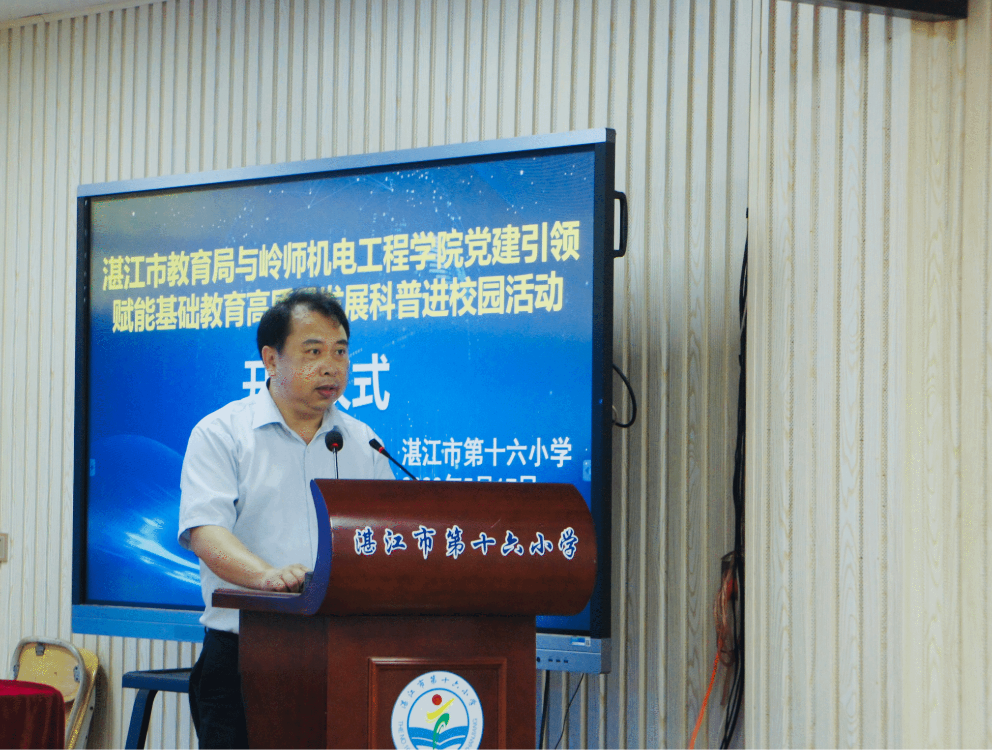 5月17日,湛江市教育局与岭南师范学院机电工程学院联合举办的党建引领赋能基础教育高质量发展科普进校园活动开班仪式在湛江市第十六小学南六楼录播室举行。机电工程学院党委书记莫琼玉,湛江市第十六小学校长李水佺、副校长陈婷、李志能,校招投标中心副主任党支部副书记刘宇靖、综合科科长安倩岚、机器人工程系主任吕莹、教工第一党支部支委陈小军、机器人工程系陈韬、辅导员等出席开班仪式。