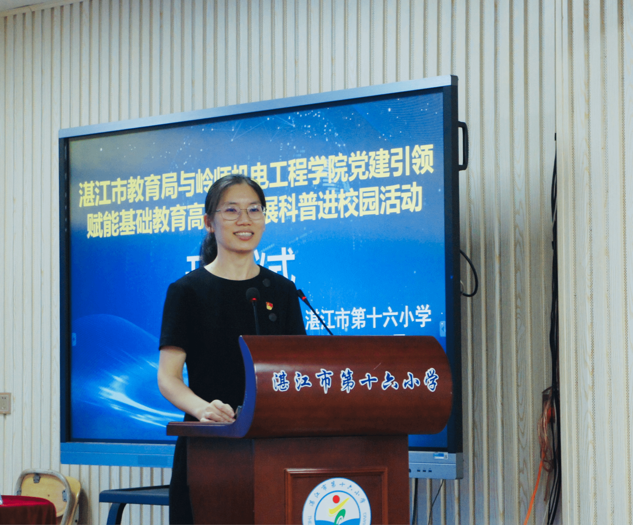 莫琼玉介绍学院的办学规模、人才培养、专业特色、师资队伍、教学科研等情况。她指出,为响应国家科教兴国战略,主动服务粤西基础教育高质量发展,加强校地合作,我院与市教育局联合在中小学试点开展科普进校园活动,在市教育局指导下,我院将通过学科和师资力量优势在中小点广泛推广人工智能科普进校园活动,激发青少年的创新能力和创新意识。她勉励十六小的孩子们从小爱科学、学科学、讲科学、用科学,从小立志将实现中华民族伟大复兴为己任。最后,她表示将不断在赋能基础教育高质量发展工作中发挥专业优势,并结合十六小办学特色和优势基础,高质量推进“科创+实践”育人工作,推动学践结合,为中小学协同育人做出机电应有的贡献,彰显建设社会主义现代化强国赋予教育的使命担当。