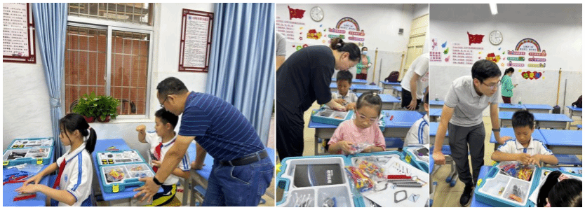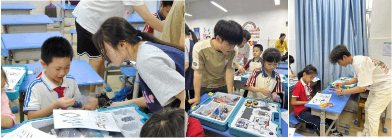 理论知识学习结束后,同学们来到了动手制作环节。学校为每一位同学配备了少年科学实验箱,其中包含若干结构零件和电器零件。实践环节中,教工党员与学生党员走到讲台下,手把手教学如何组装秋千,同学们在指导下动手实践起来。