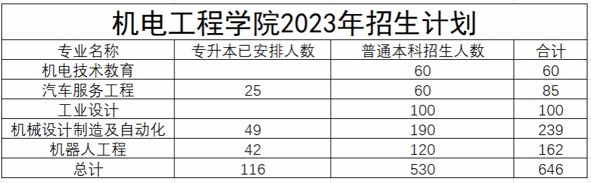 机电工程学院2023年招生计划